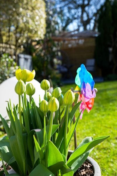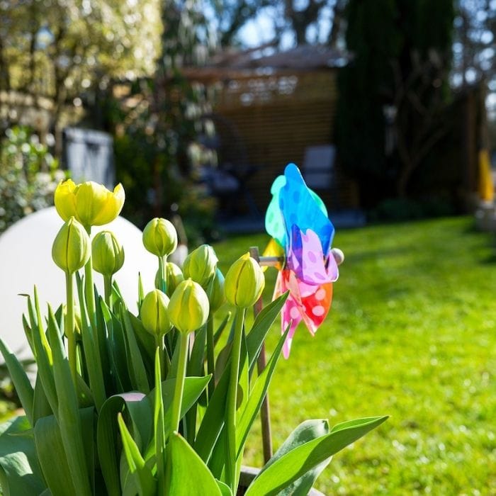 Two images: a hopscotch for children to play and some tulips sit flowering alongside a colourful windmill.